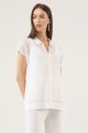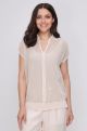 Джемпер прямого силуэта выполнен в стиле Tennis core, связан в полупрозрачную сетку из вискозы. Рукав цельнокроенный, спущенный, средней ширины. Воротник - поло, отложной, с вырезом, обработанным планкой. Низ джемпера связан широкой планкой, в боковых швах которой имеются аккуратно вывязанные разрезы, делающие силуэт еще более свободным. Рекомендуется носить с топом в тон цвета. Актуален и вариант с контрастным цветом. Комплект займет достойное место при создании универсального гардероба, так как он гармонично сочетается с юбкой, брюками и шортами. Изделия из вязаной сетки воздушны и элегантны, практичны для жаркого лета, поэтому их популярность растет с каждым сезоном.